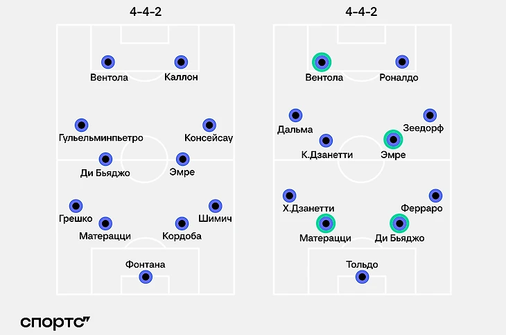 Купер на ответный матч сделал семь замен в основе! Сохранил только Луиджи Ди Бьяджо, Эмре Белезоглу, Матерацци и Вентолу. Зато появились оба Дзанетти, Зеедорф и Роналдо.