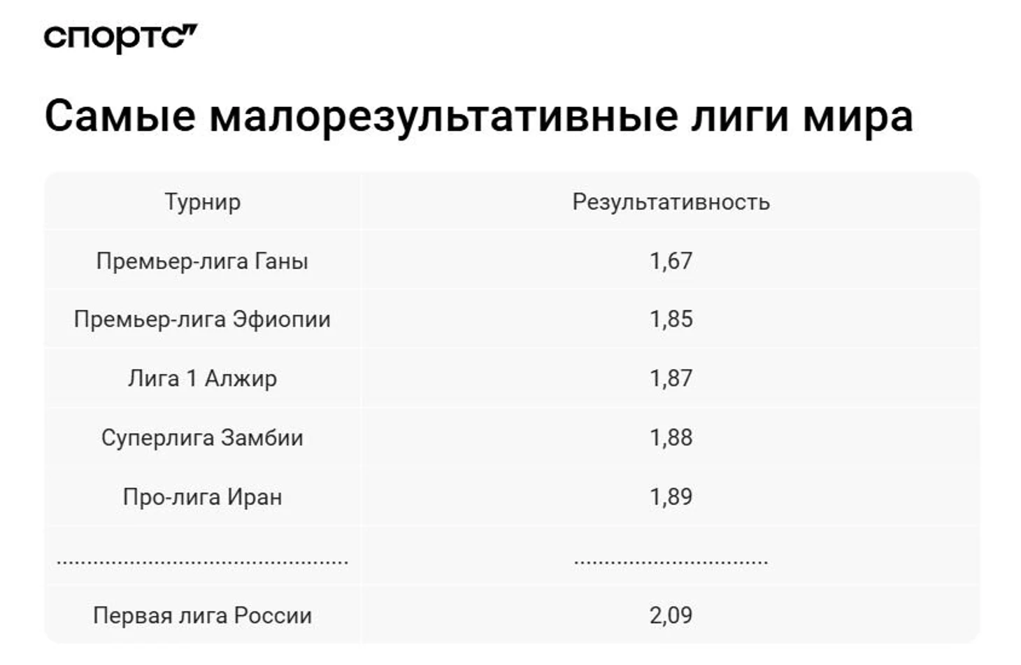 В мире конкурентов значительно больше. Например, меньше двух мячей забивают в иранском высшем дивизионе, а выше (или ниже?) всех в этой гонке элитный дивизион Ганы (1,67).
