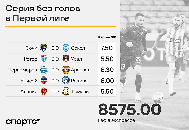 Самая неожиданная нулевая ничья в серии – у «Сочи» с «Соколом», там можно было ловить коэффициент 7.50. Теоретический экспресс на все матчи без голов мог бы зайти с общим коэффициентом 8575.00.