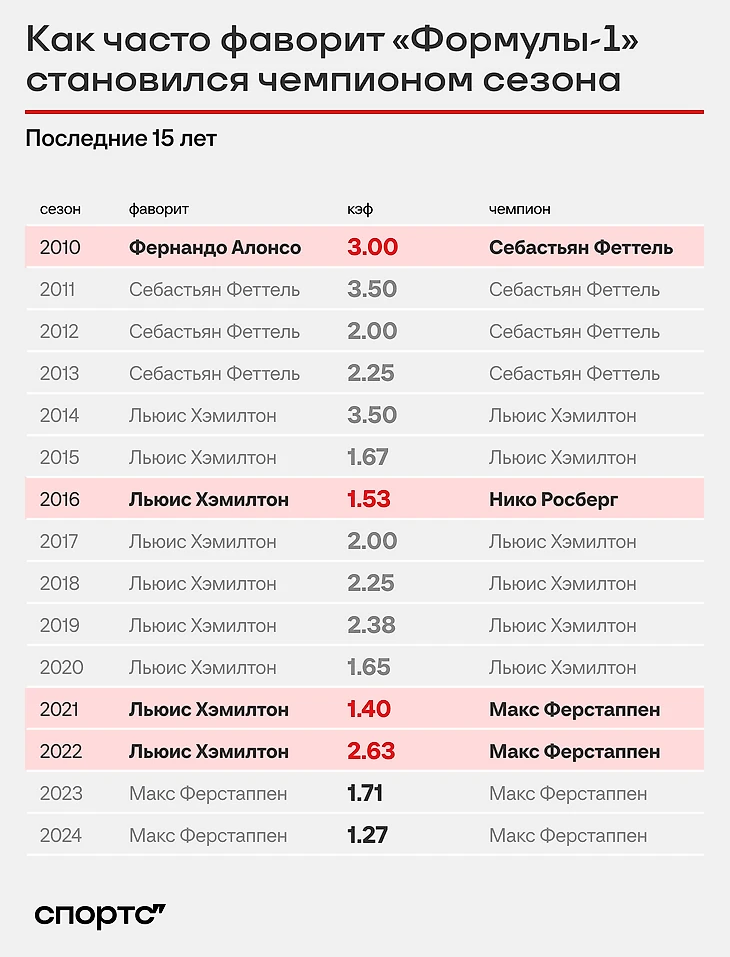 Букмекеры за 15 лет почти не ошибались в прогнозе чемпиона «Ф-1». Кого уже короновали в этом году?