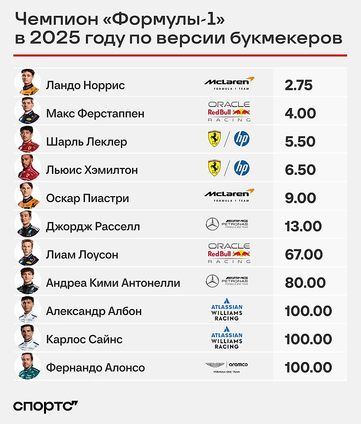 В пределах коэффициента 100.00 находятся 11 гонщиков. Вот как выглядит прогноз букмекеров на сезон.