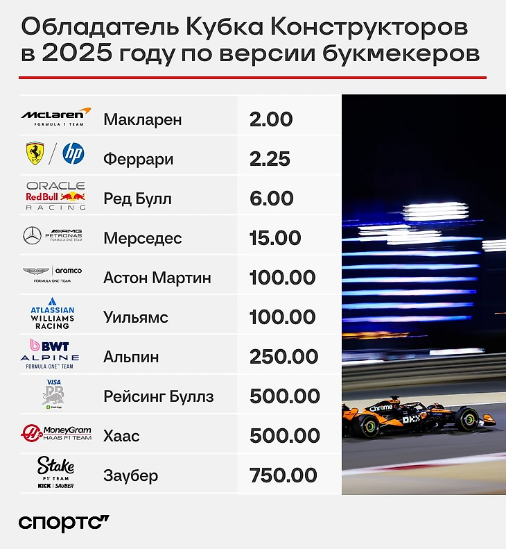 Перед прошлым сезоном доминирование Ферстапппена сказывалось на раскладах. «Ред Булл» к тому времени выиграл два подряд чемпионата и в сезон-2024 въезжал с вероятностью титула в 83%. А будущему чемпиону «Макларену» давали лишь 13% – и сработало.