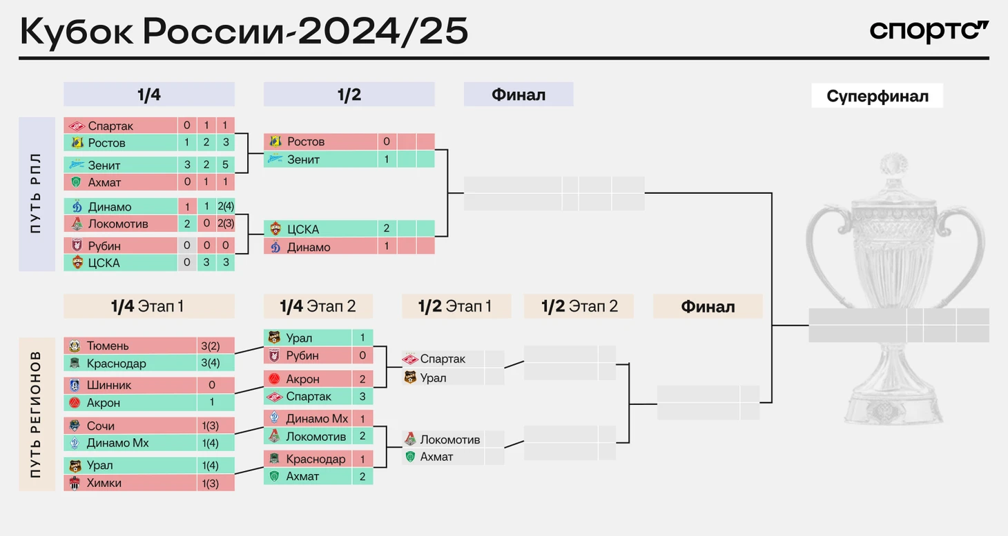 Если выиграют все фавориты пар у букмекеров, то в финал Пути РПЛ пройдут ЦСКА и «Зенит». Такая пара была и в прошлом розыгрыше. А в нижней части останутся четыре представителя РПЛ: «Спартак», «Локомотив», «Ростов» и «Динамо».