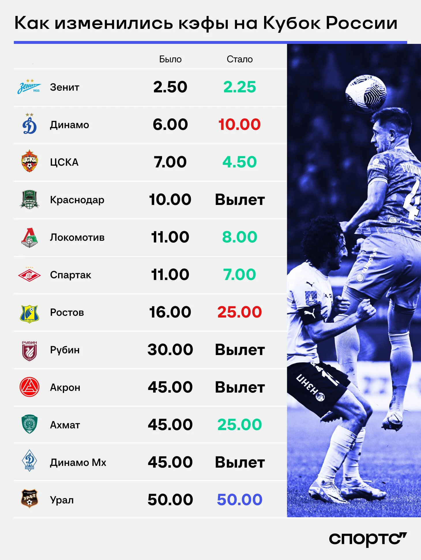 Екатеринбург вспомнит об уровне топ-клубов РПЛ, сыграв со «Спартаком». Коэффициент на победу в Кубке России у главного аутсайдера вообще не изменился. Слишком сложный жребий.