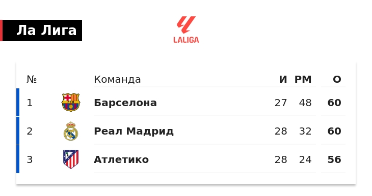 Напоминаем, первый пункт при равенстве очков – личные встречи. «Реал» проиграл «Барселоне» 0:4, с «Атлетико» у него дважды по 1:1. «Барса» уступила «Атлетико» дома 1:2, а в гостях обыграла 4:2.