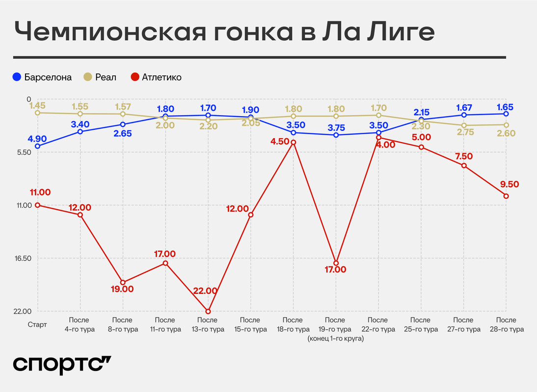 В 28-м туре «Барселона» выдала сумасшедший камбэк в гостях у «Атлетико»: из 0:2 в 4:2 за 26 минут. «Матрасники» теперь отстают от каталонцев и «Реала» на четыре очка, однако картина не стала более четкой. В этом сезоне лидеры отыгрывали друг у друга даже по восемь очков.