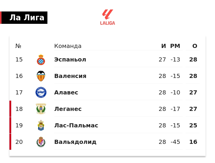 «Вальядолид» безнадежно вылетает, а оставшихся два места постараются избежать «Лас-Пальмас», «Леганес», «Валенсия», «Алавес» и «Эспаньол».