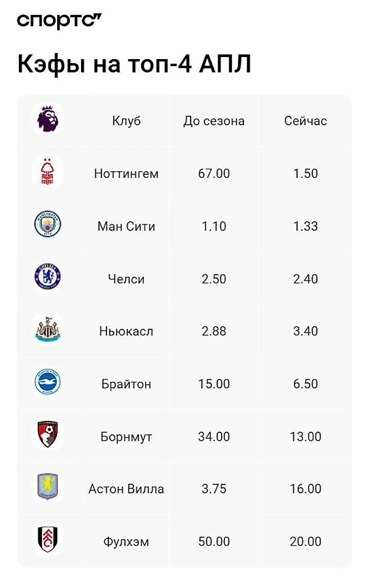 «Форест» создал себе пять очков задела от «Челси», поэтому кэф просел до 1.50. До сезона на финиш «Ноттингема» в топ-4 можно было ставить за 67.00. Ниже шансы были только у двух новичков. Интересно, что коэффициент 67.00 давали и на «Саутгемптон».