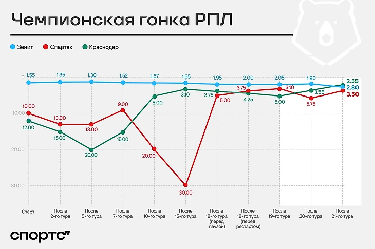 У букмекеров теперь 2.55 на «Краснодар», 2.80 – на «Зенит» и 3.50 на «Спартак».