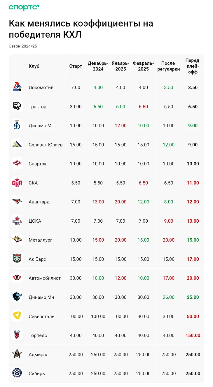 ● Перед сезоном главным фаворитом считался СКА, а его основными конкурентами – «Авангард», «Локомотив» и ЦСКА. Сейчас чуть другая история: «Локомотив» – фаворит, СКА шел рядом по котировкам, но уступил место «Трактору».