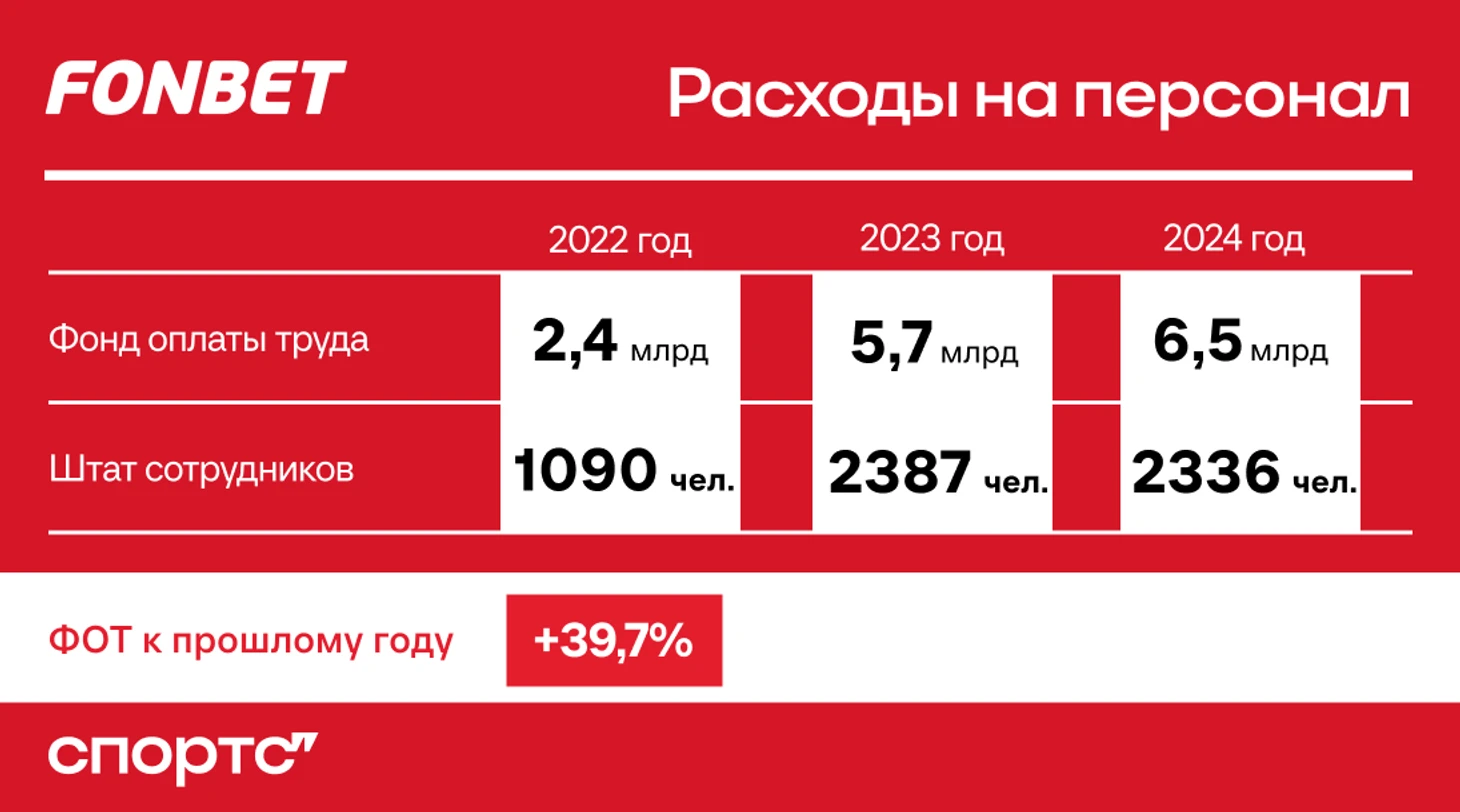 В «Фонбете» был заметный приток сотрудников в 2023 году, их количество почти не изменилось дальше. А фонд оплаты труда – вырос.