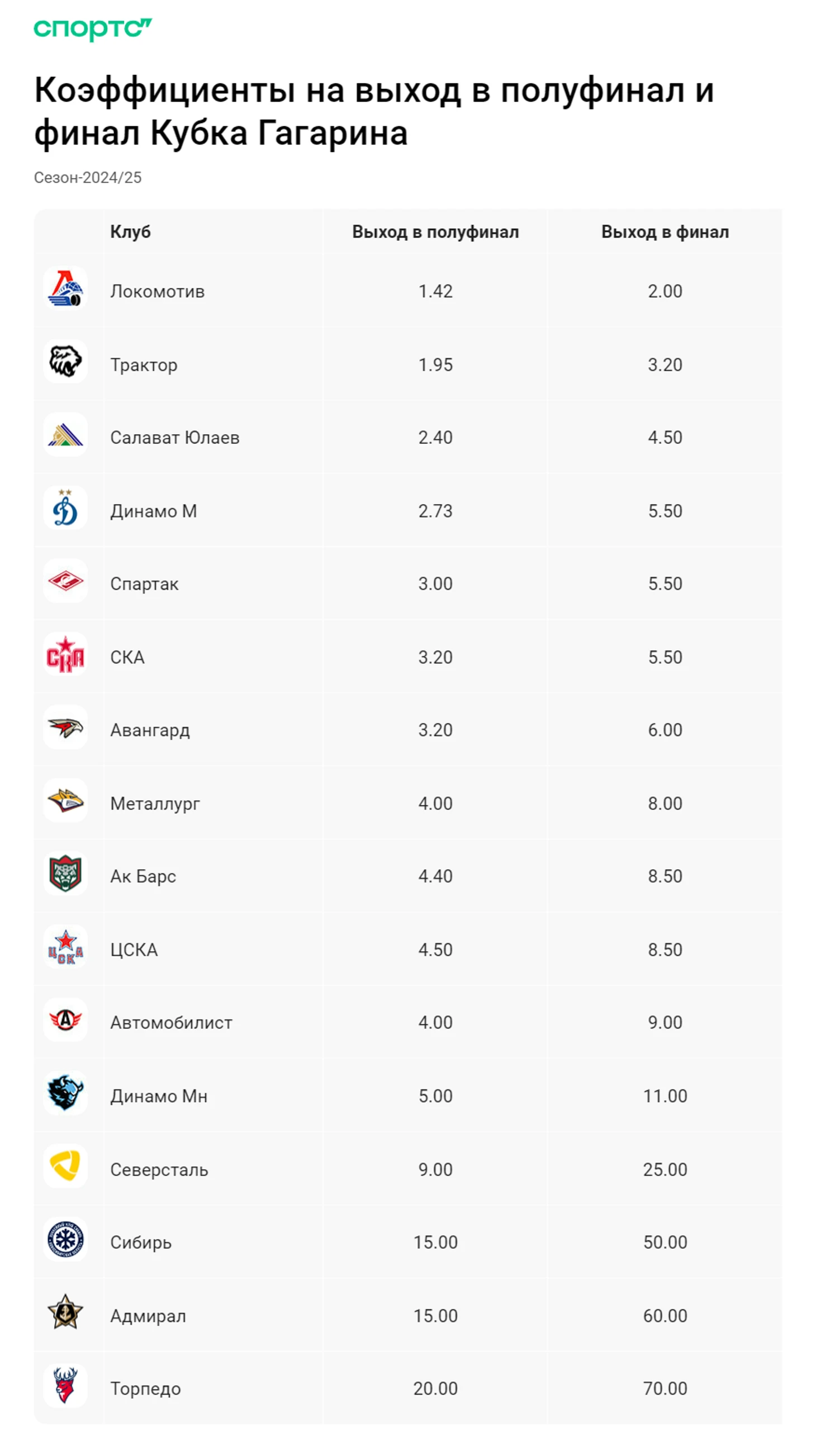 СКА перед сезоном был главным фаворитом, а его основными конкурентами – «Авангард», «Локомотив» и ЦСКА. Теперь фаворит «Локомотив», а СКА спустился ниже пятерки, хотя даже по итогам регулярки вместе с «Трактором» делил второе место по коэффициентам.