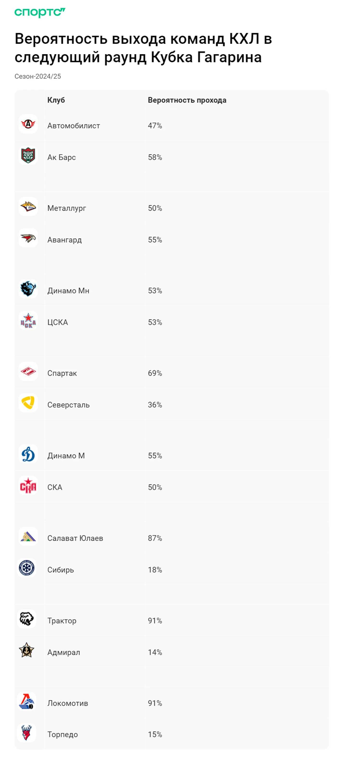 Из всех участников плей-офф меньше 10% на выход в полуфинал получили только «Сибирь», «Адмирал» и «Торпедо» – три главных аутсайдера предстоящих матчей. Неподалеку – «Северсталь». У остальных десяти команд, не считая «Локомотива» и «Трактора», вероятность выхода в полуфинал колеблется между 20% и 42%.