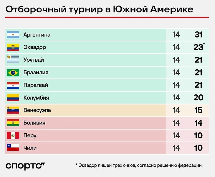 С шестеркой уже давно все ясно: Аргентина, Эквадор, Уругвай, Бразилия, Парагвай и Колумбия. Колумбийцы в четырех матчах набрали одно очко, но все равно запас над Венесуэлой колоссальный: разрыв в две победы. Отыграть за четыре тура – маловероятно, учитывая разницу в классе.