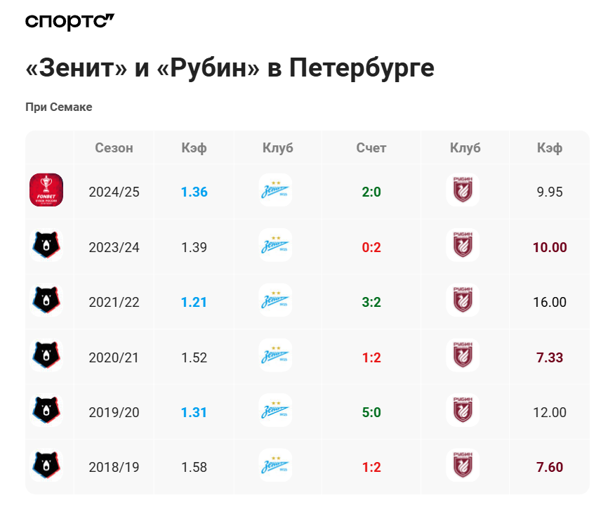 Любопытно, что сейчас как раз очередь поражения «Зенита». Последний раз «Рубин» был в Петербурге осенью 2024-го. Команда Семака тогда уверенно победила 2:0 в Фонбет Кубке России и досрочно вышла в плей-офф. К слову, матч запомнился первым результативным действием Александра Соболева за «Зенит»: он отдал ассист на Густаво Мантуана.