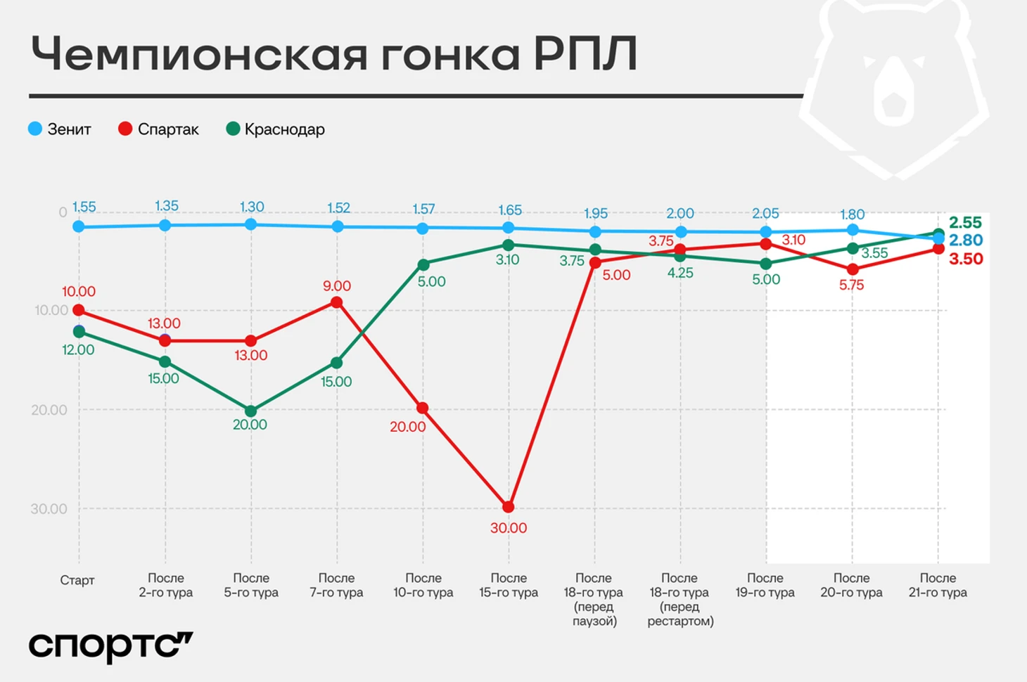 Однако «Зенит» больше занят офсайдом в матче со «Спартаком» и опровержением слухов о скандале Семака с Максимом Глушенковым. Еще один эффект поражения от красно-белых: петербуржцы впервые в сезоне не котируются главными фаворитами РПЛ.