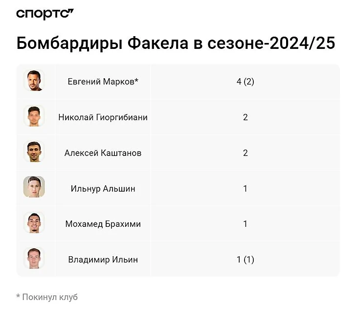Зимой руководство клуба продало Евгения Маркова в «Урал». Опытный нападающий был лучшим бомбардиром «Факела» с четырьмя голами. Сделка стала рекордной продажей в истории команды – за игрока было заплачено 350 тысяч евро (данные Transfermarkt).