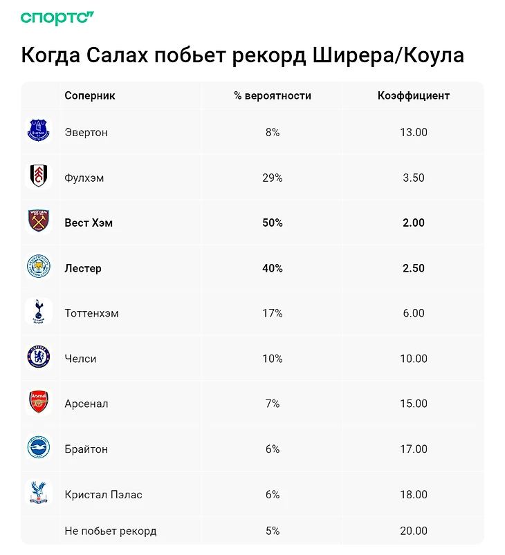 А если рекорд не получится установить? Кажется, что возможно такое только в двух случаях – или какой-то крупной ссоры внутри клуба, или травмы. Мы такого Салаху не желаем, но букмекеры все равно оставляют небольшую вероятность того, что египтянин не наберет нужные четыре очка. Правда, она не более 5%.