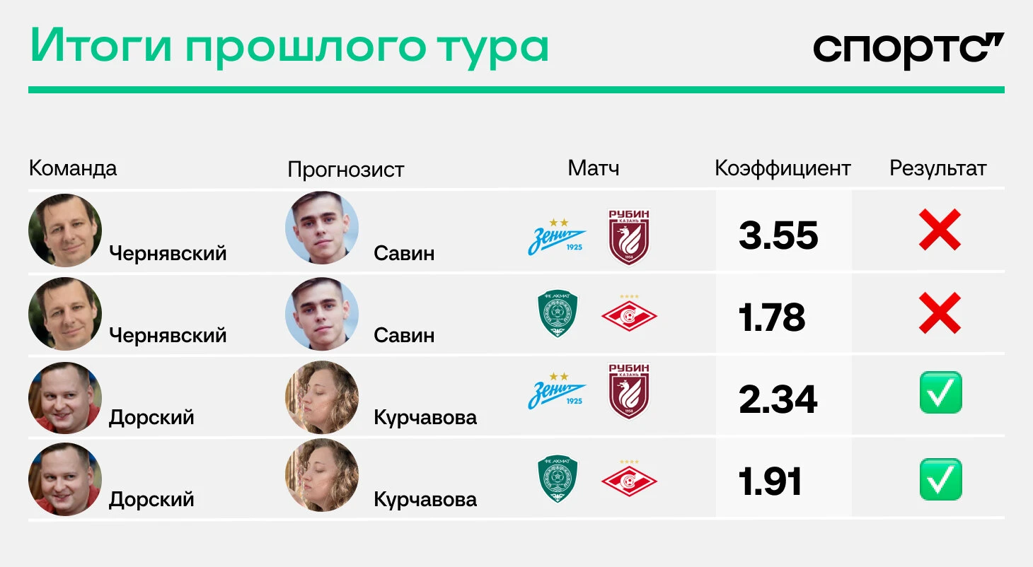 В прошлом туре случилась легкая локальная победа Любови Курчавовой: оба ее прогноза оказались правильными, а вот Андрей Савин дважды не угадал.