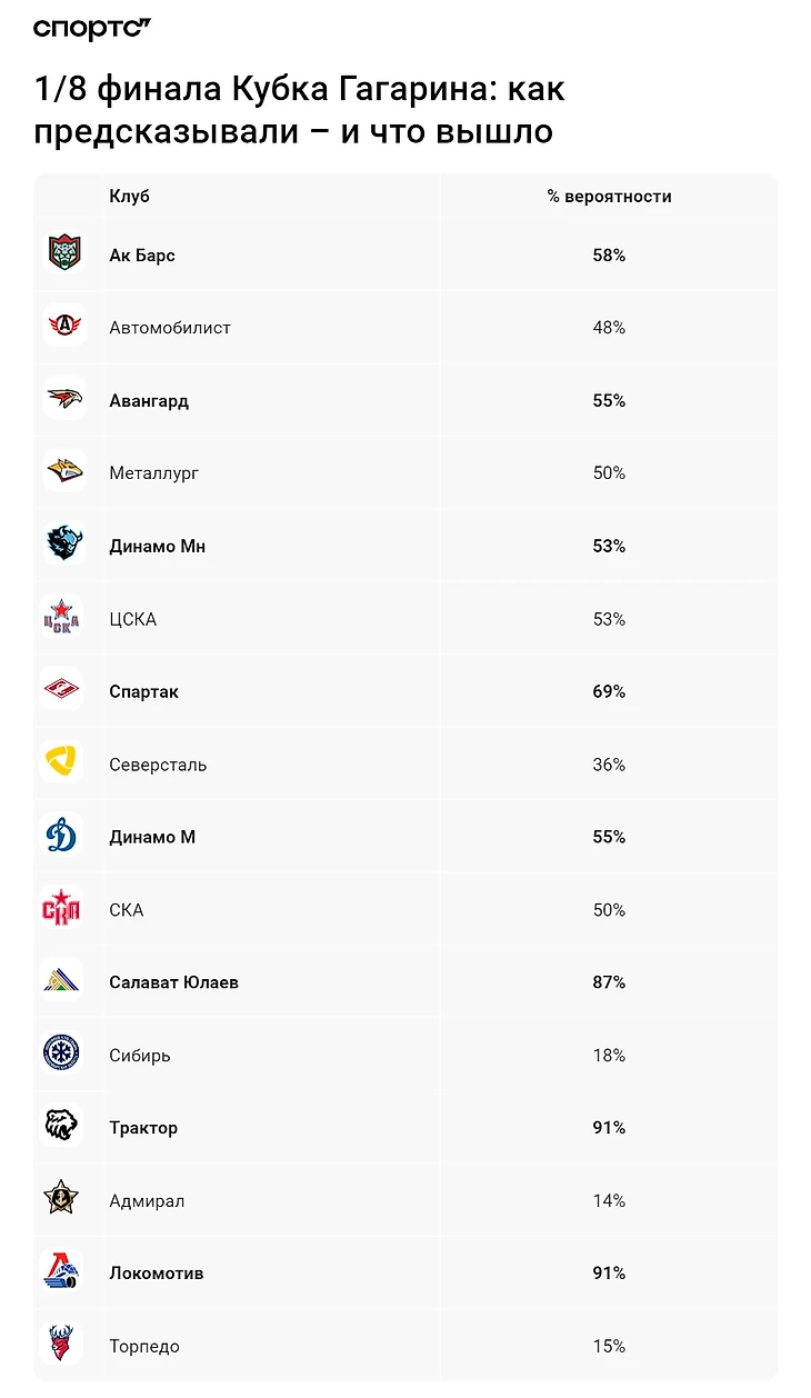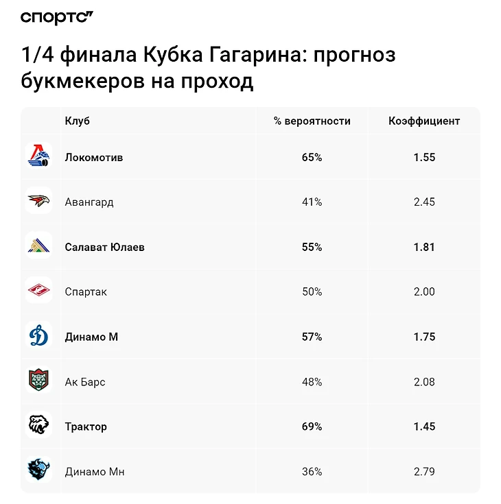 Перед плей-офф в пятерке фаворитов шли «Локомотив», «Трактор», «Динамо» М, «Салават Юлаев» и «Спартак». Теперь вместо «Спартака» – «Авангард», омичи тогда котировались седьмым.