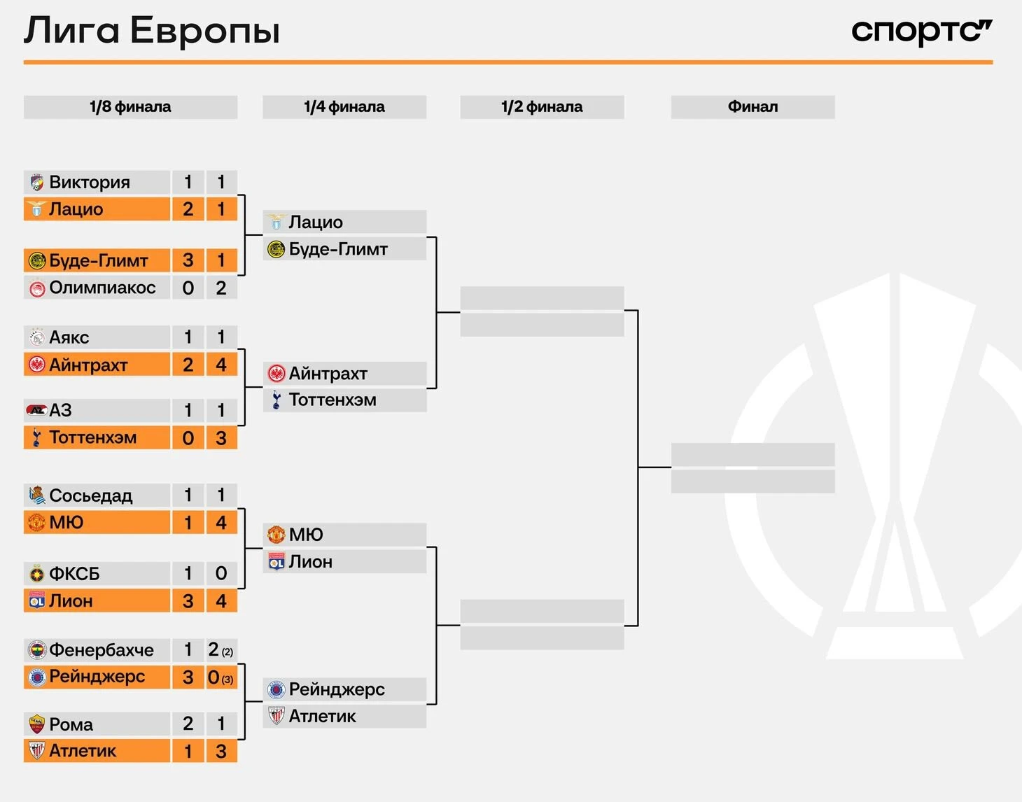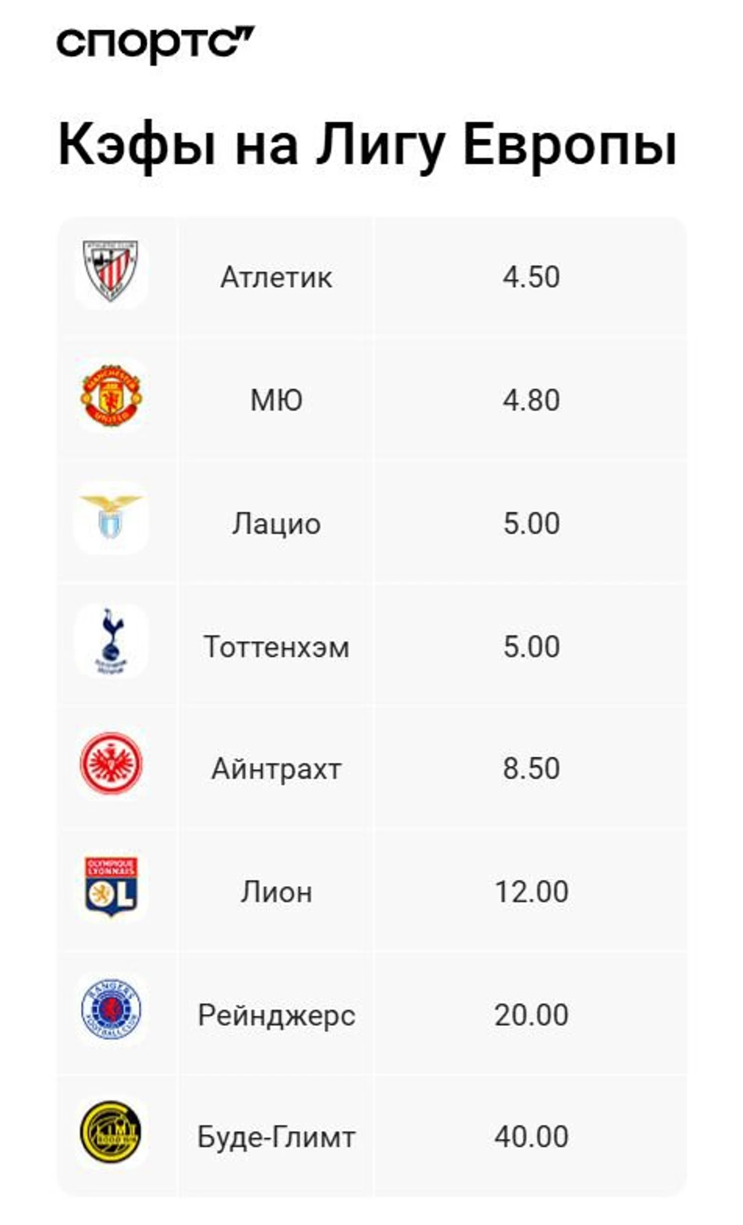 Лига Европы – самый запутанный еврокубок по раскладам до четвертьфиналов. Сразу пять команд считаются реальными претендентами на трофей. В БЕТСИТИ коэффициент до 10.00 сейчас стоит у «Атлетика», «МЮ», «Лацио», «Тоттенхэма» и «Айнтрахта». Формальным фаворитом считается будущий хозяин финала – решающий матч пройдет в Бильбао. Баски возглавили линию уже по ходу плей-офф. Изначально выше ставили «Манчестер Юнайтед» и «Тоттенхэм»