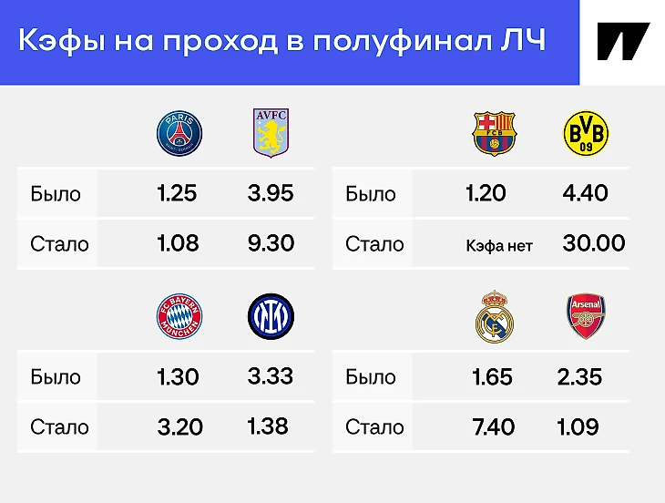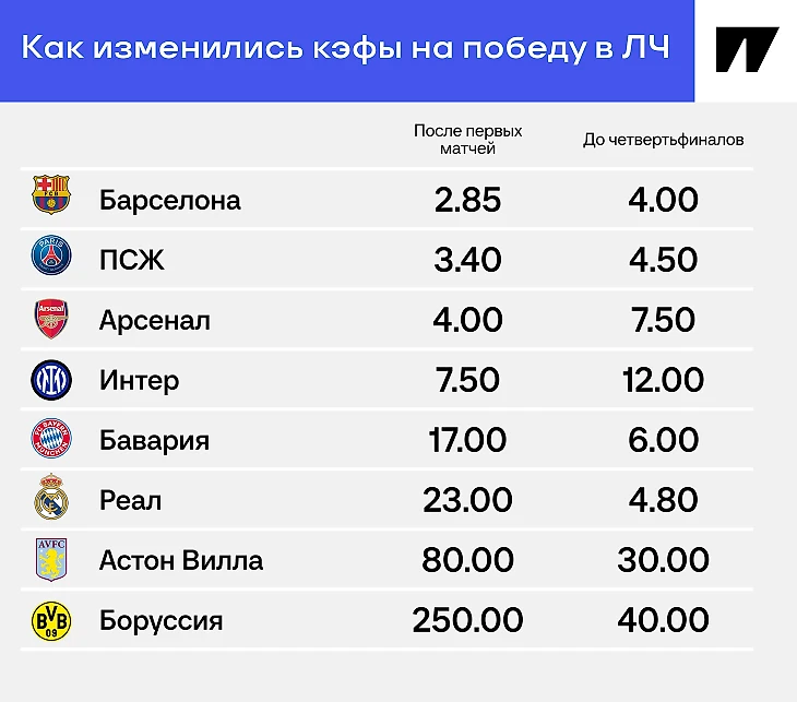 После вторничных матчей главным фаворитом по некоторым версиям (например, суперкомпьютера Opta) становился «Арсенал» – пока ждали шагов других фаворитов. Как только «Барса» и «ПСЖ» победили тоже, они лондонцев сдвинали.