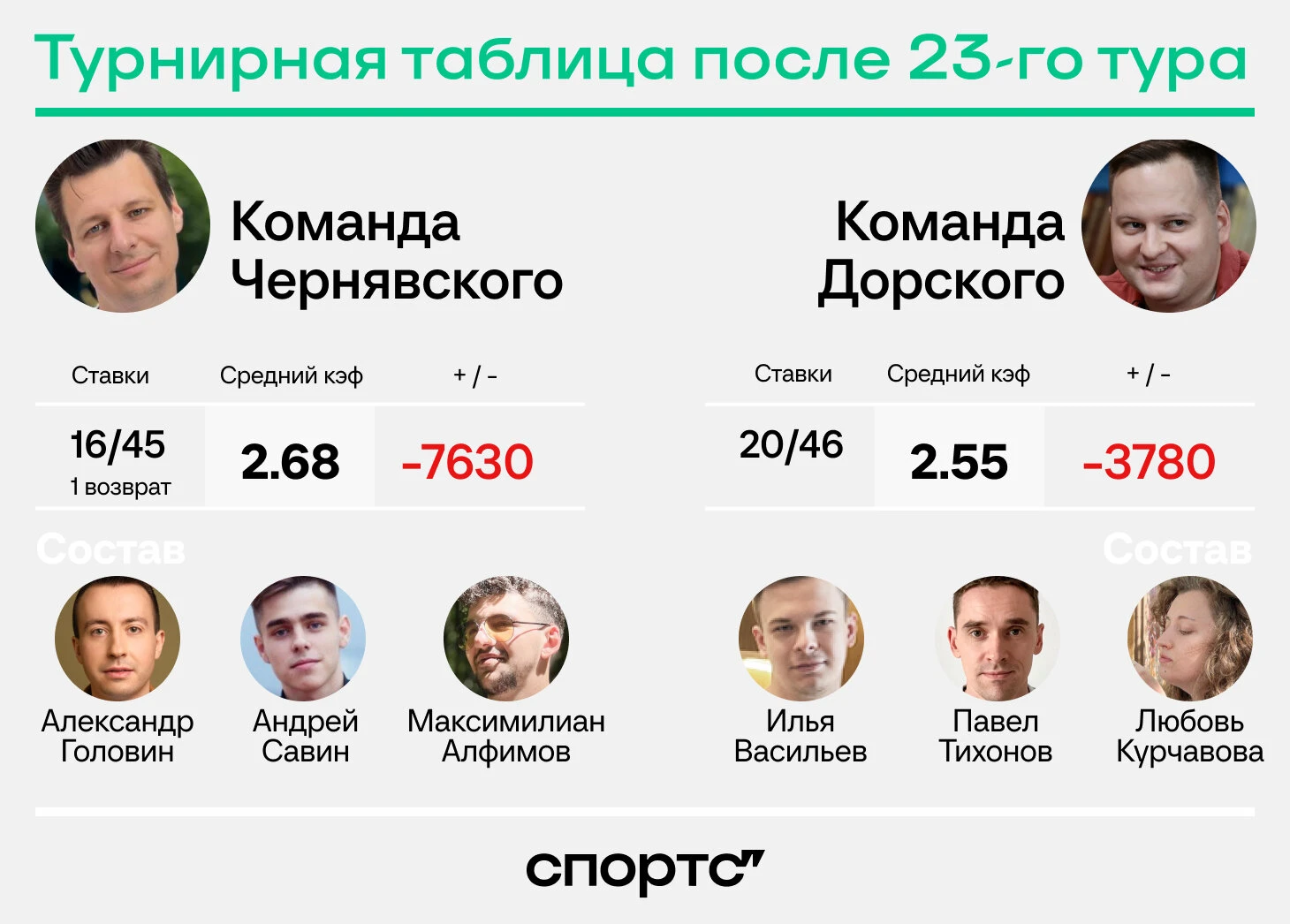 Соперничают две команды главных экспертов по российскому футболу: четверка Глеба Чернявского (Александр Головин, Максимилиан Алфимов, Андрей Савин) и дримтим Александра Дорского (Илья Васильев, Павел Тихонов и Любовь Курчавова).