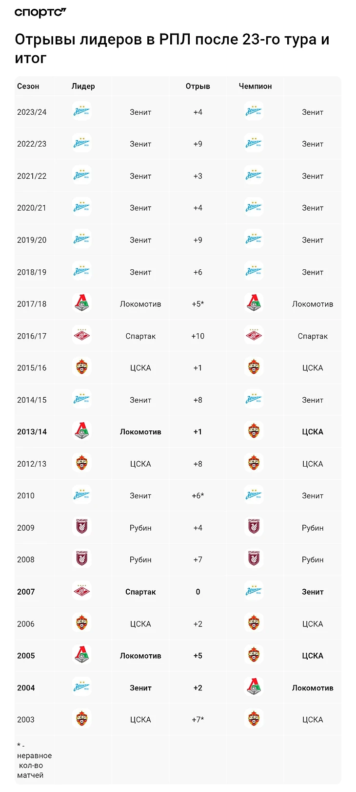 Мы посмотрели отрывы лидеров после 23 туров в последние 20 сезонов. Не включили только переходный сезон-2011/12, потому что там было не 30 туров, а 44.