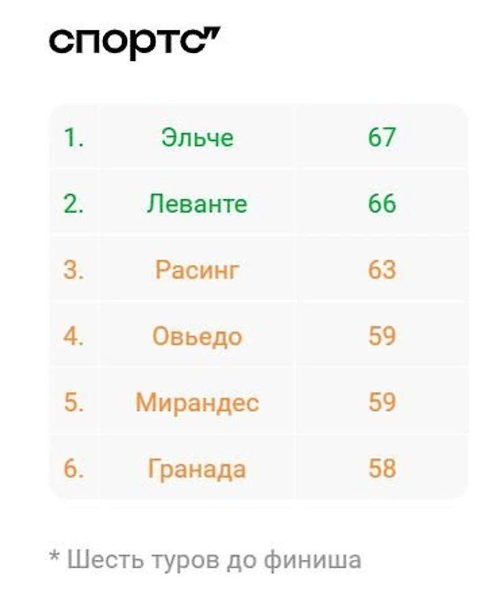 За шесть туров до финиша расклад поменялся: «Эльче» и «Леванте» все ближе к возвращению, а «Расинг» отправится в плей-офф.