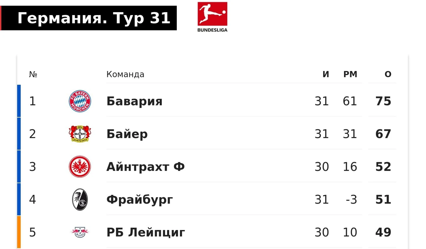 Чемпионская гонка в Германии давно предрешена, но все-таки «Бавария» весной отвлекалась на плей-офф ЛЧ и теряла очки в чемпионате: не справились с «Унионом», потом с «Дортмундом». Повезло, что «Байер» тоже не был идеален и отстал на восемь перед ключевым отрезком.