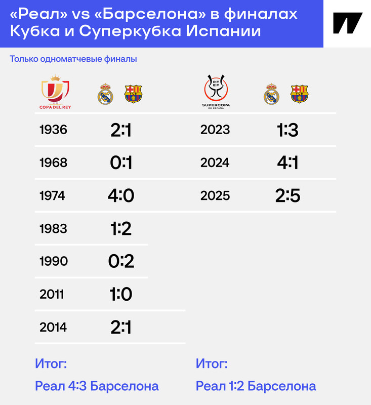 Это первое класико в финале турнира с 2014-го и лишь третье в XXI веке. Добавим сюда финалы Суперкубка Испании – и получим интересную статистику противостояния во внутренних кубках.