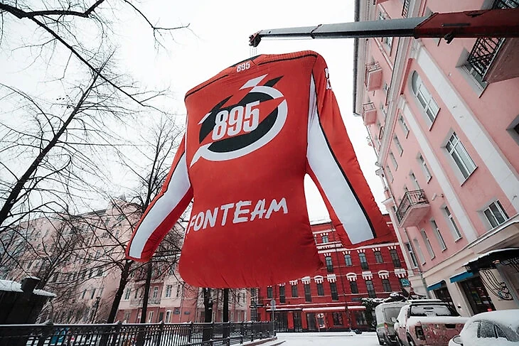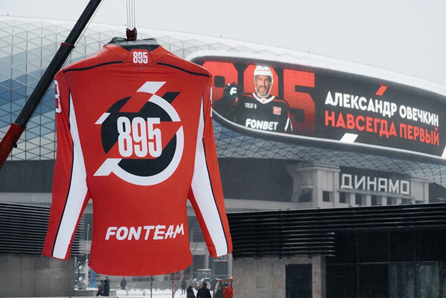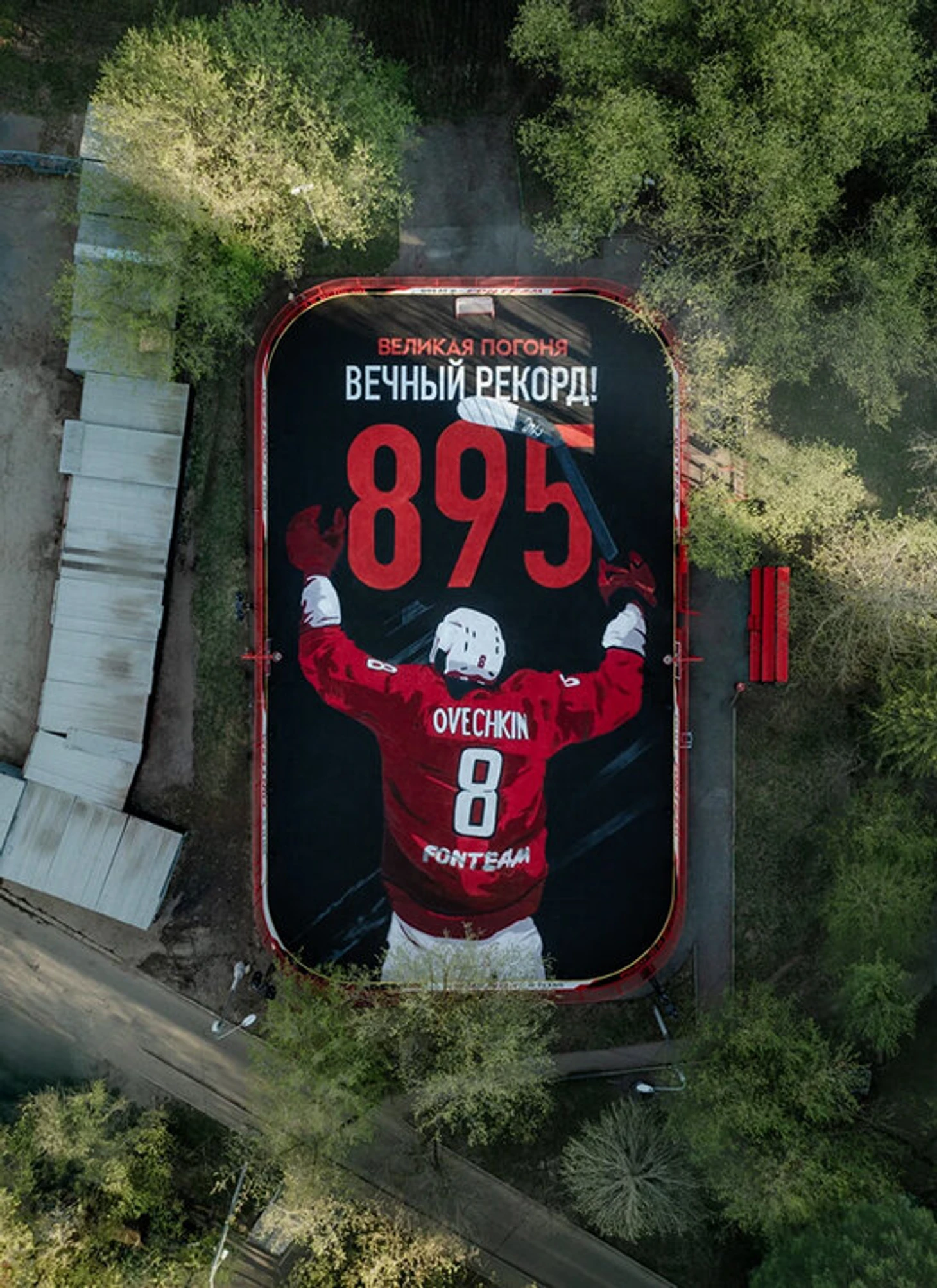 Теперь FONBET решил поздравить Ови масштабным перформансом. Сразу после 895-й шайбы по всей Москве появились огромные джерси. На спине находится привычный 8-й номер и фамилия хоккеиста, а на лицевой стороне – число 895.