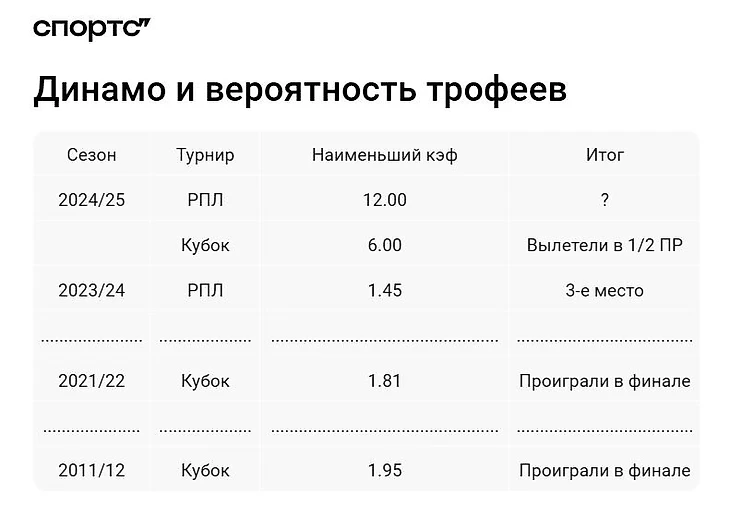 В нынешнем сезоне предел «Динамо» – 17-18% от аналитиков. До матча со «Спартаком» на титул команды давали 9.00.