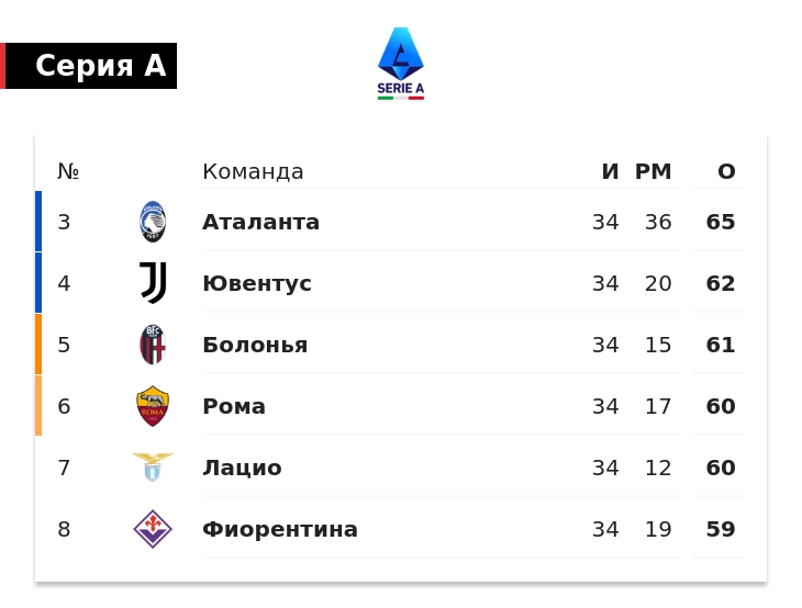 «Интер» и «Наполи» рубятся за скудетто, а на оставшиеся две позиции в зоне ЛЧ претендуют «Аталанта», «Ювентус», «Болонья», «Рома», «Лацио» и «Фиорентина».