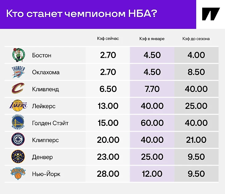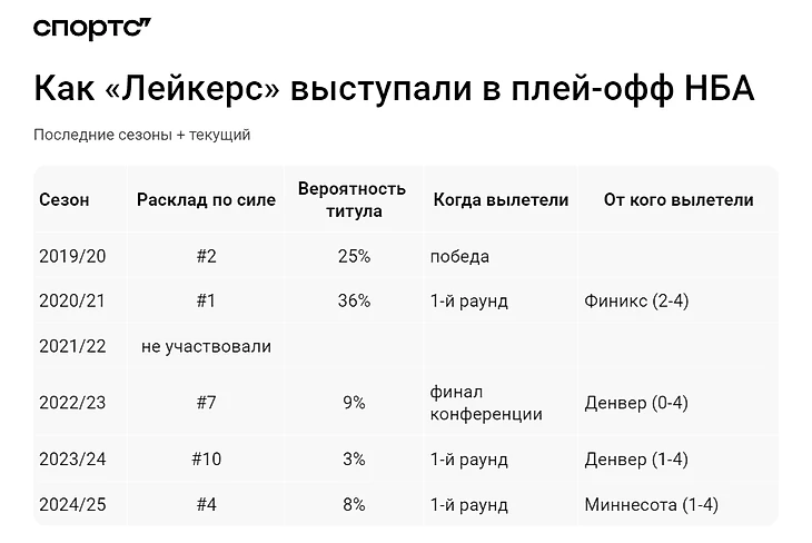 С другой стороны, в этом сезоне все произошло в соответствии с предсезонными котировками: девятое место по силе и только 4% на титул. В начале года «Лейкерс» по раскладам вообще спустились во второй десяток с 3% веры в итоговый успех, но с середины января по начало марта выдали ударный отрезок в 20 побед за 24 матча, так что и шансы возросли.