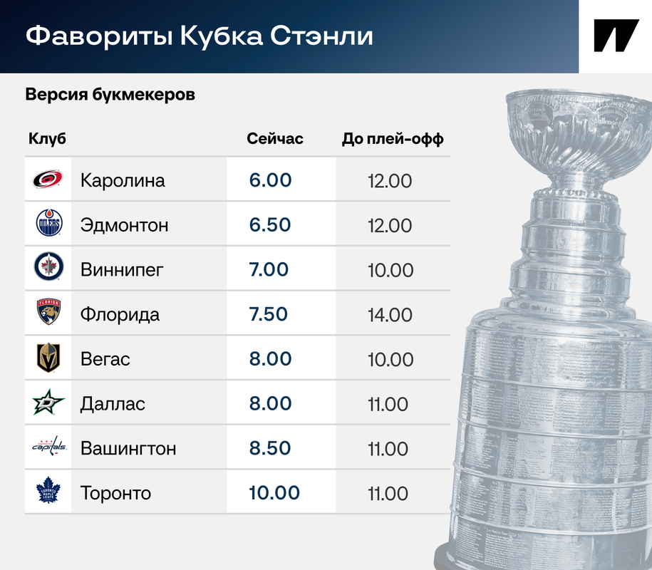 Теперь список возглавила «Каролина», «Эдмонтон» и «Виннипег» рядом. Но плотность такая же аномальная. Важно уточнить, что даже букмекеры между собой не разобрались, кто главный фаворит. Рейтинг на нашей иллюстрации – одна из версий.