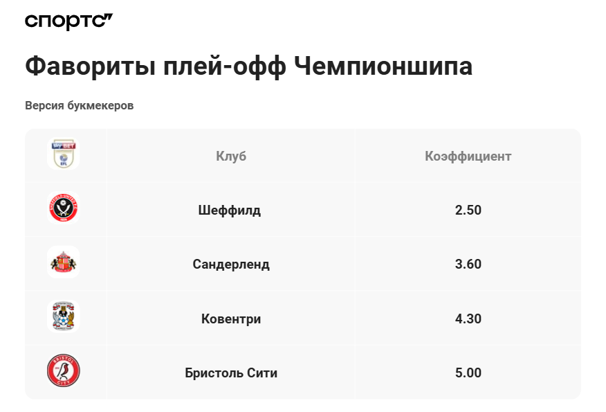 Команды стоят тесно, но «Шеффилд» выделяется. При этом клуб уже пять раз играл в плей-офф Чемпионшипа, но ни разу не выходил в АПЛ: два поражения в полуфинале и три – в финале.