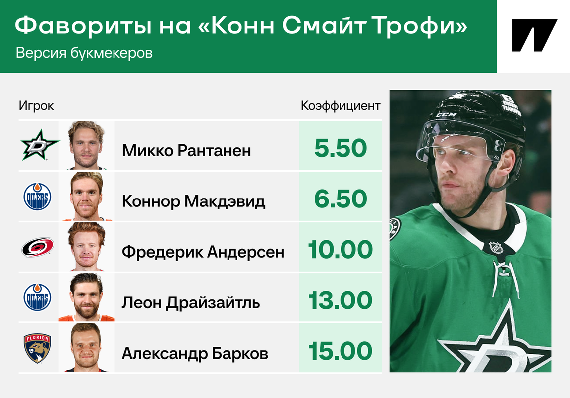 Микко обошел их всех. Единственный конкурент на сегодня – Макдэвид. Ожидается, что Рантанен рано или поздно остынет, так что букмекеры не торопятся отпускать его далеко от Коннора. Интригу усиливает их потенциальная заруба в финале Западной конференции, если «Даллас» и «Эдмонтон» туда выйдут. А выйдут ли?