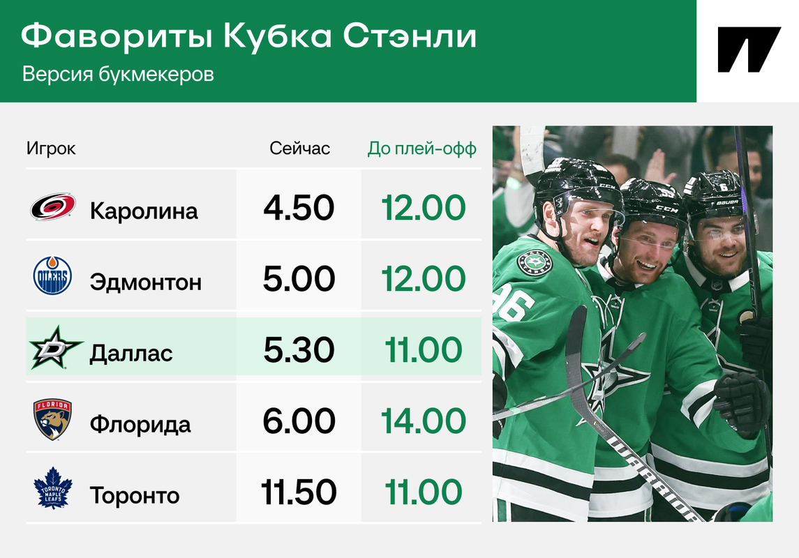 Перед плей-офф НХЛ букмекеры не могли выделить ярко выраженного фаворита. Каждый расставлял команды по-своему. Однако почти у всех «Даллас» шел в топ-5.
