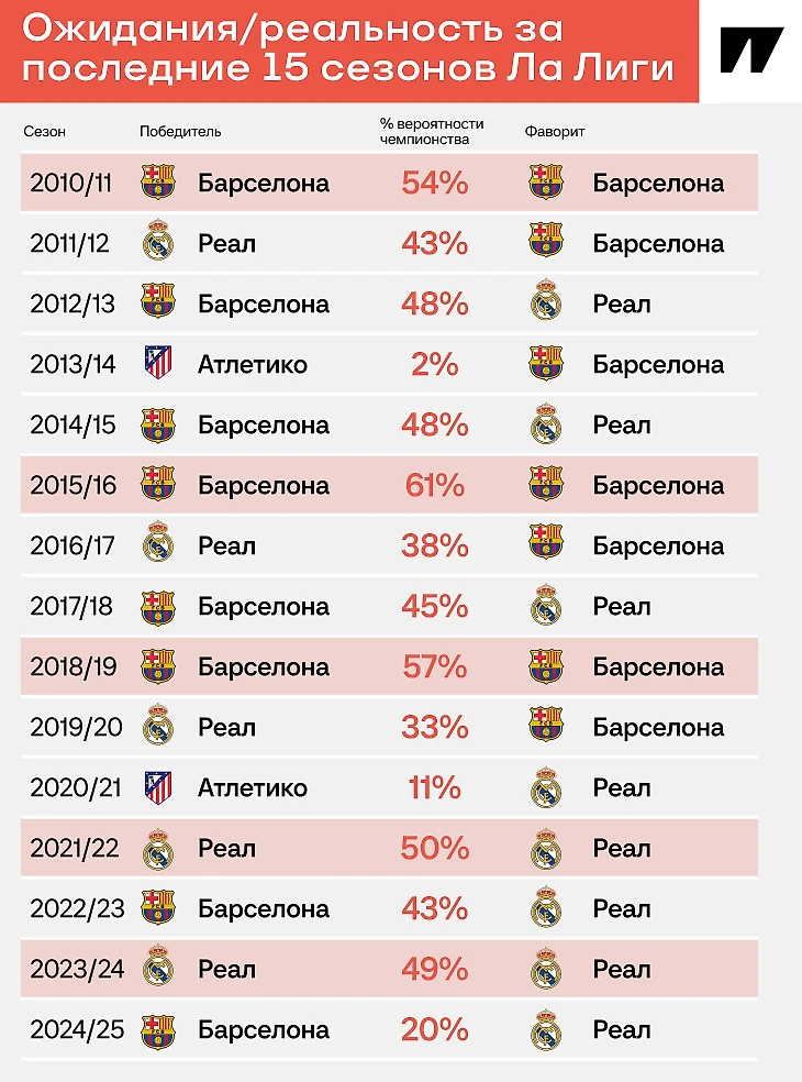 Трижды прогнозы оправдывала «Барселона», дважды – «Реал». Четыре раза «Барса» упускала чемпионство, хотя считалась фаворитом, с «Реалом» так было шесть раз.
