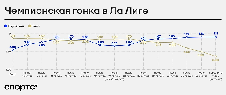 На время «Барса» получила чуть больше шансов, потом «Реал» ненадолго вернул себе статус, после 25-го тура они шли вровень и сошлись почти в одной точке у букмекеров – но дальше двинулись разными дорогами.