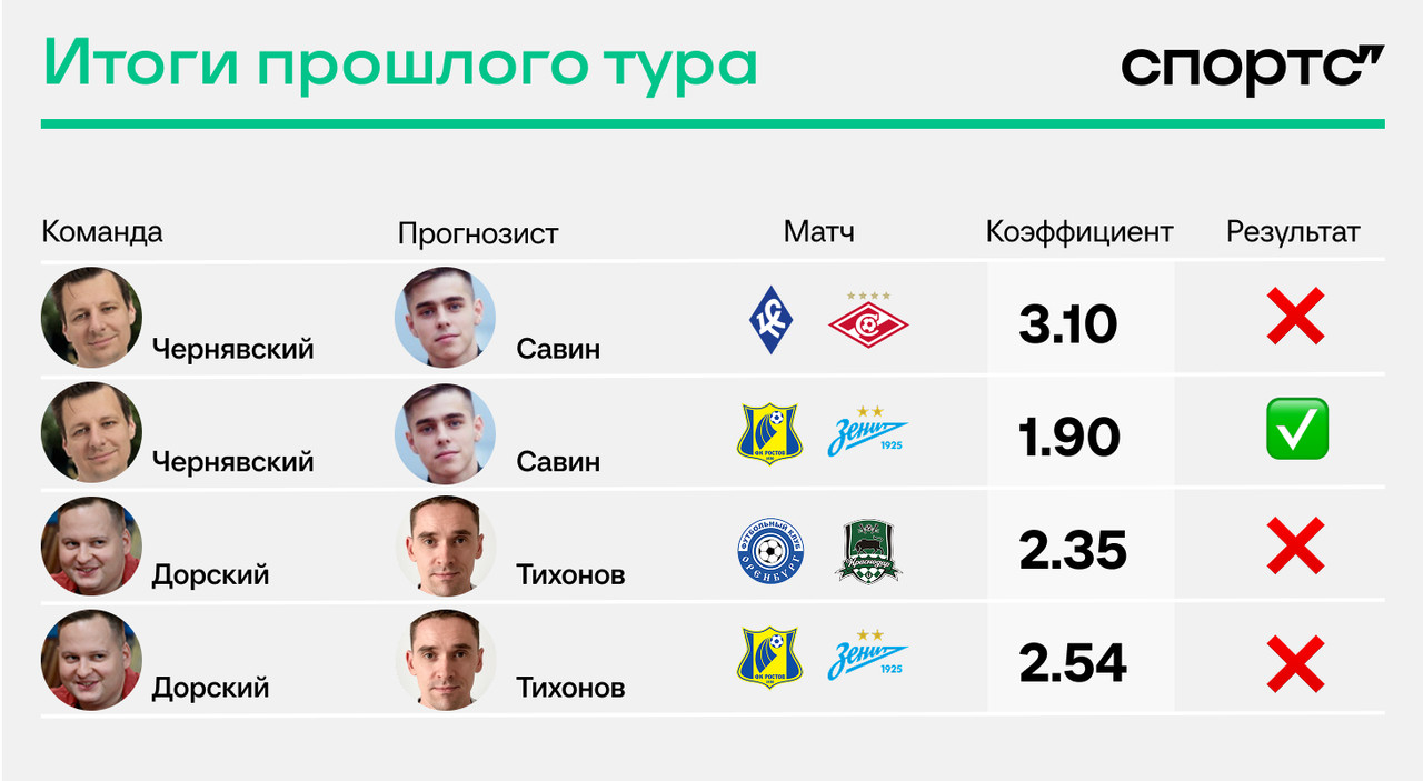 В прошлом туре у Савина и Тихонова случилась одна победа и три проигрыша – не оправдались сомнения в «Спартаке» и «Зените».