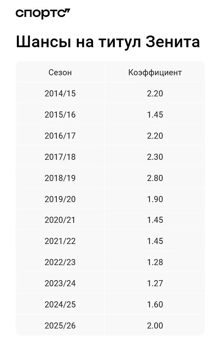 С сезона-2014/15 первым у аналитиков всегда стоял «Зенит». Меньше всего верили в первый год Сергея Семака. Тогда после провала с Роберто Манчини коэффициент был 2.80. Дальше – устрашающая динамика для конкурентов.