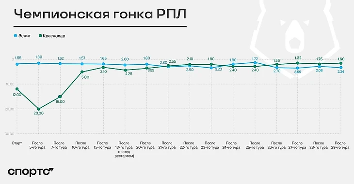 В чемпионстве «Краснодара» пока не видят долгосрочного сигнала. Букмекеры уже предлагают 2.00 на титул «Зенита» в следующем сезоне. Это ощутимо выше 1.60 после прошлогоднего 30-го тура, но все же сильно не дотягивает до спада после Манчини.