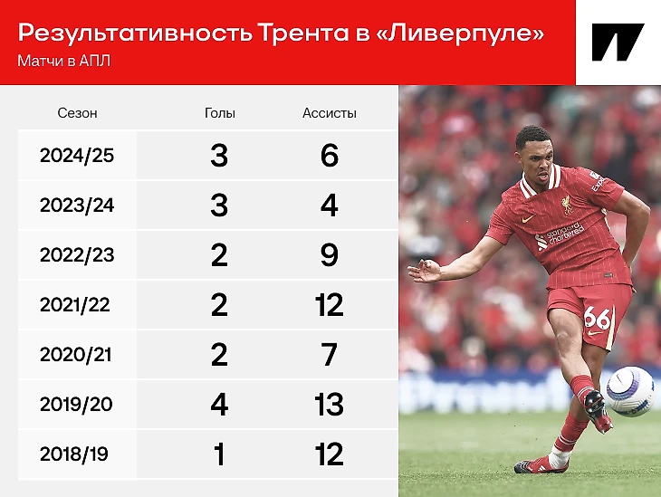 В остальном Александер-Арнолд стабилен: три года подряд забивал по два мяча в АПЛ, затем два сезона с тремя мячами.