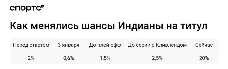 А в январе до победной серии «Индиану» почти похоронили: коэффициент на титул взлетел до 150.00. Мощный финиш в регулярном чемпионате глобально не изменил расклады. До плей-офф «Индиана» в рейтинге букмекеров шла 11-й с коэффициентом 67.00 на титул. Например, шансы «Хьюстона» были выше.
