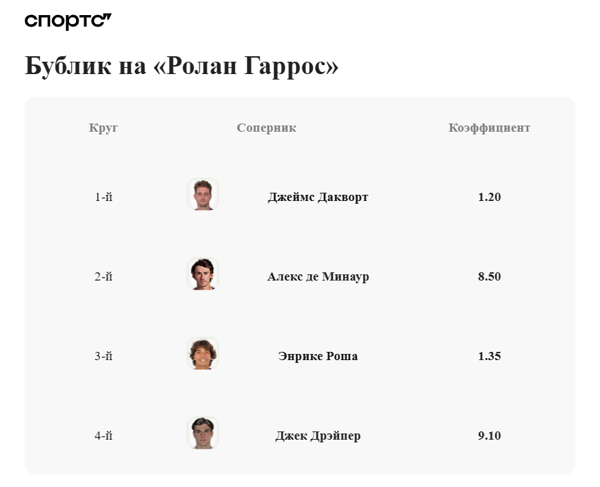 Перед «РГ» чтобы увидеть Бублика среди фаворитов, нужно было несколько раз прокрутить страницу вниз. У российских аналитиков казахстанца и вовсе не было – он ведь никогда не проходил дальше второго круга в Париже, зачем его вообще котировать?