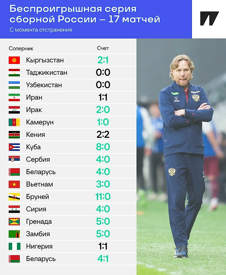 После отстранения россияне провели 20 игр, официальными РФС считает 17: в список не входят две встречи против Египта U-23 (там было 1:1 и 1:2) и матч с Катаром (1:1).