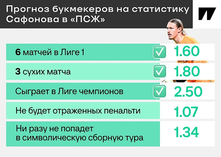Например, букмекеры полагали, что Сафонов максимум выйдет в шести матчах Лиги 1 – в итоге сыграл 10 раз. В Лиге чемпионов давали коэффициент 1.50 на то, что не появится вообще, но Луис Энрике выпустил дважды, в том числе против «Баварии».