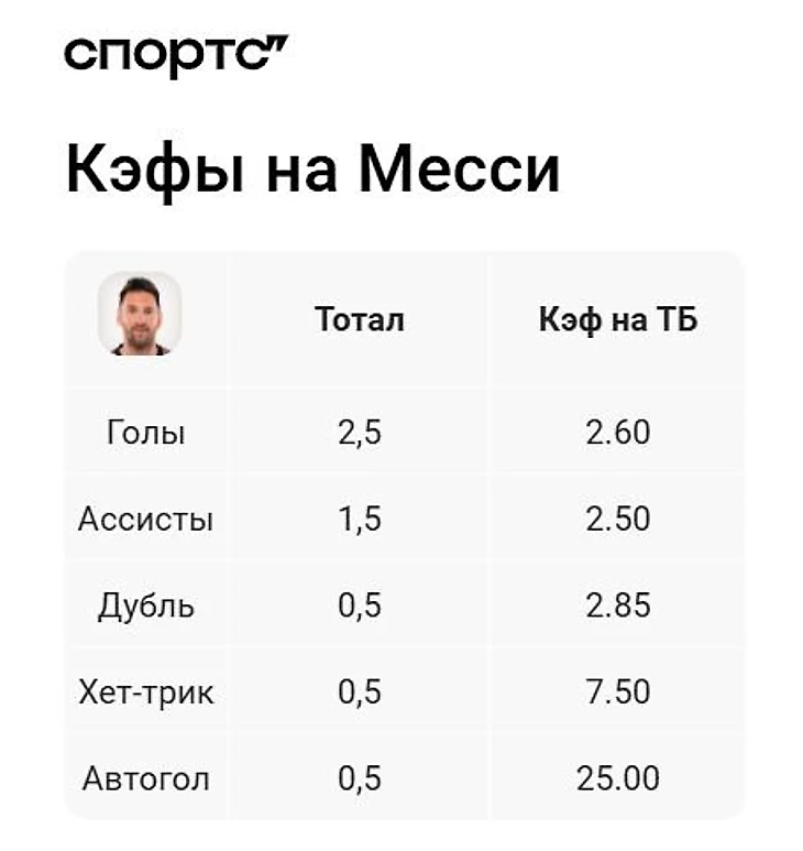 Аналитики не ждут чудес ни от самого Месси, ни и от его партнеров. Линия на Лео очень скромная: предсказывают максимум три результативных действия на турнире. «Интеру» отводят третье место в группе за «Порту» и «Палмейрасом». Коэффициент на выход в плей-офф – 2.50.